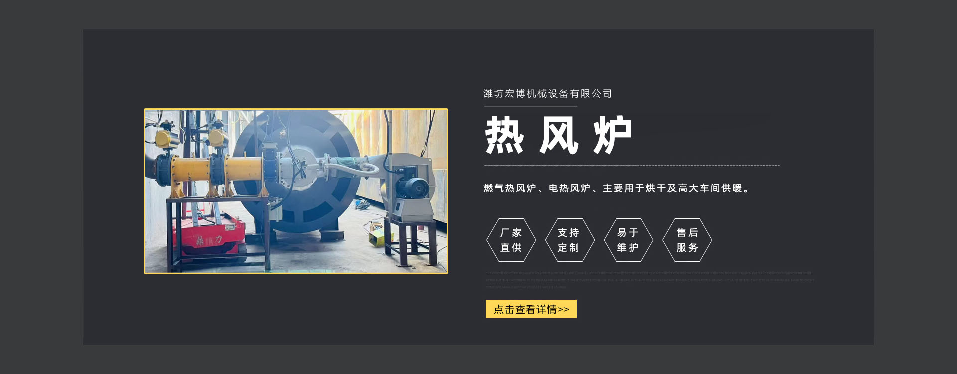 濰坊宏博機(jī)(jī)械設(shè)(shè)備有限公司是從事熱風(fēng)(fēng)爐、烘干設(shè)(shè)備、供暖設(shè)(shè)備的研發(fā)(fā)、設(shè)(shè)計(jì)(jì)、制造和服務(wù)(wù)于一體的實(shí)(shí)體企業(yè)(yè)。長(zhǎng)(zhǎng)期以來(lái),企業(yè)(yè)以市場(chǎng)(chǎng)的發(fā)(fā)展和客戶(hù)的需求為導(dǎo)(dǎo)向,集多年的生產(chǎn)(chǎn)技術(shù)(shù)與經(jīng)(jīng)驗(yàn)(yàn)為一體,不斷開(kāi)發(fā)(fā)和優(yōu)(yōu)良產(chǎn)(chǎn)品。
